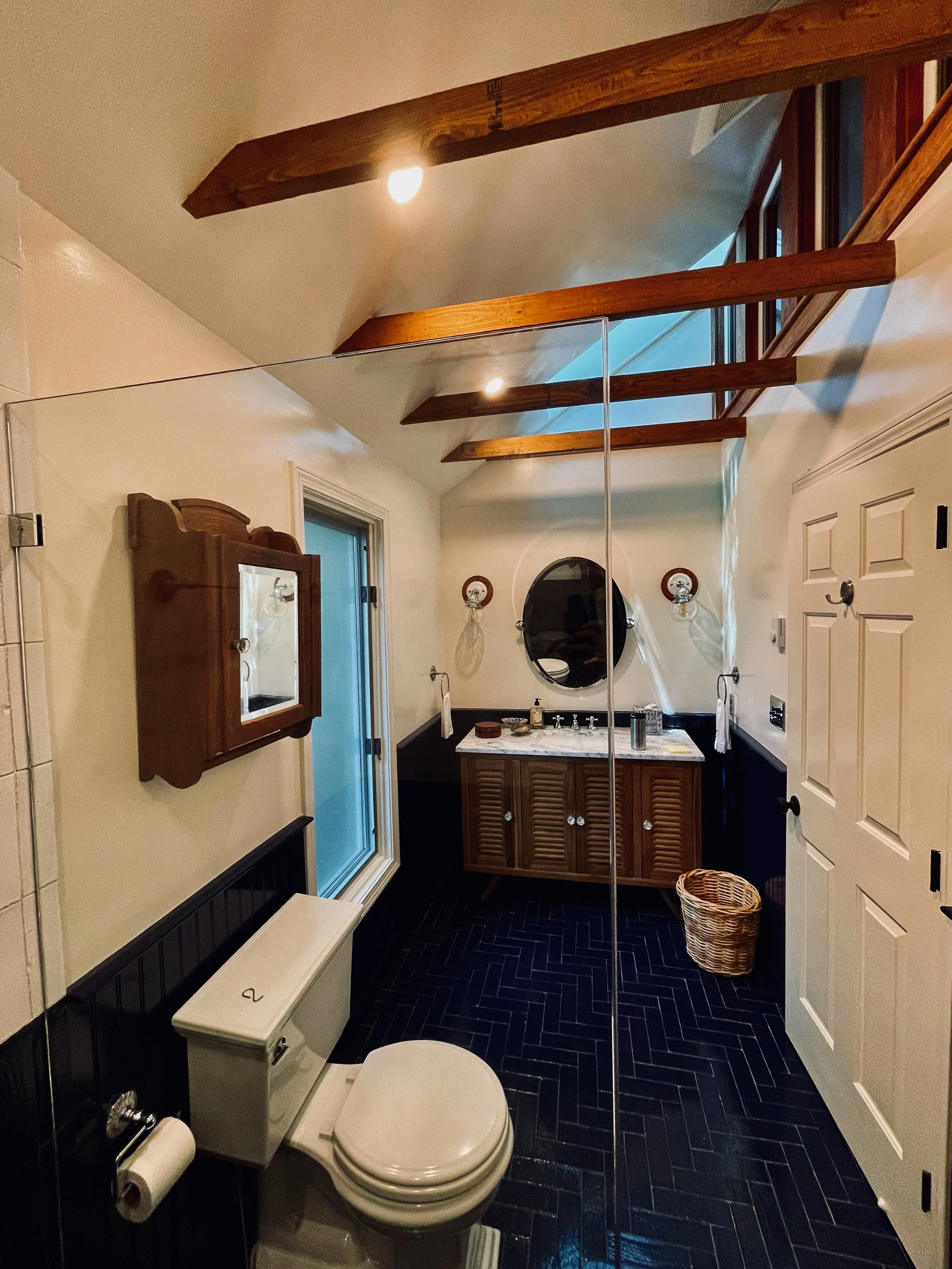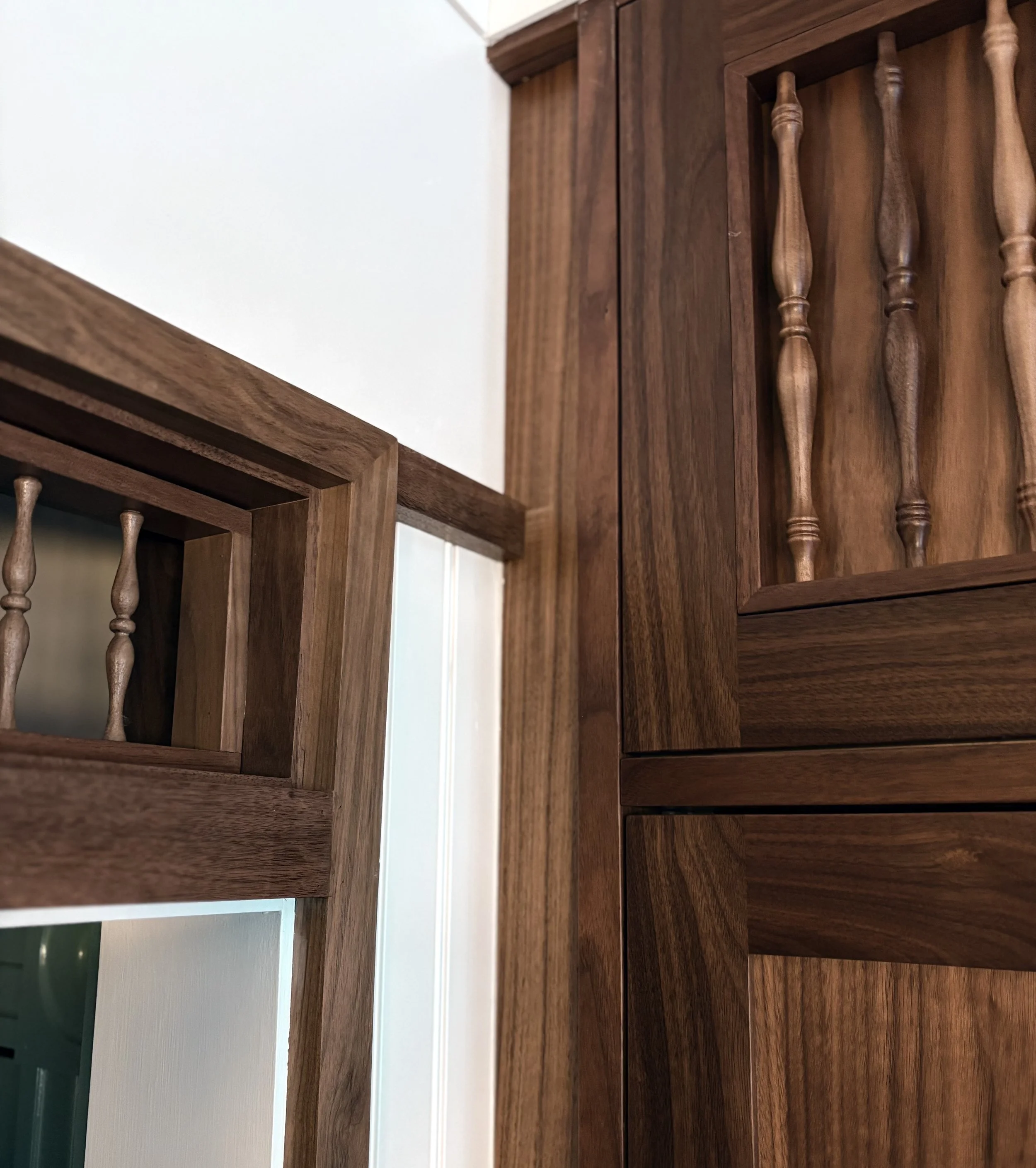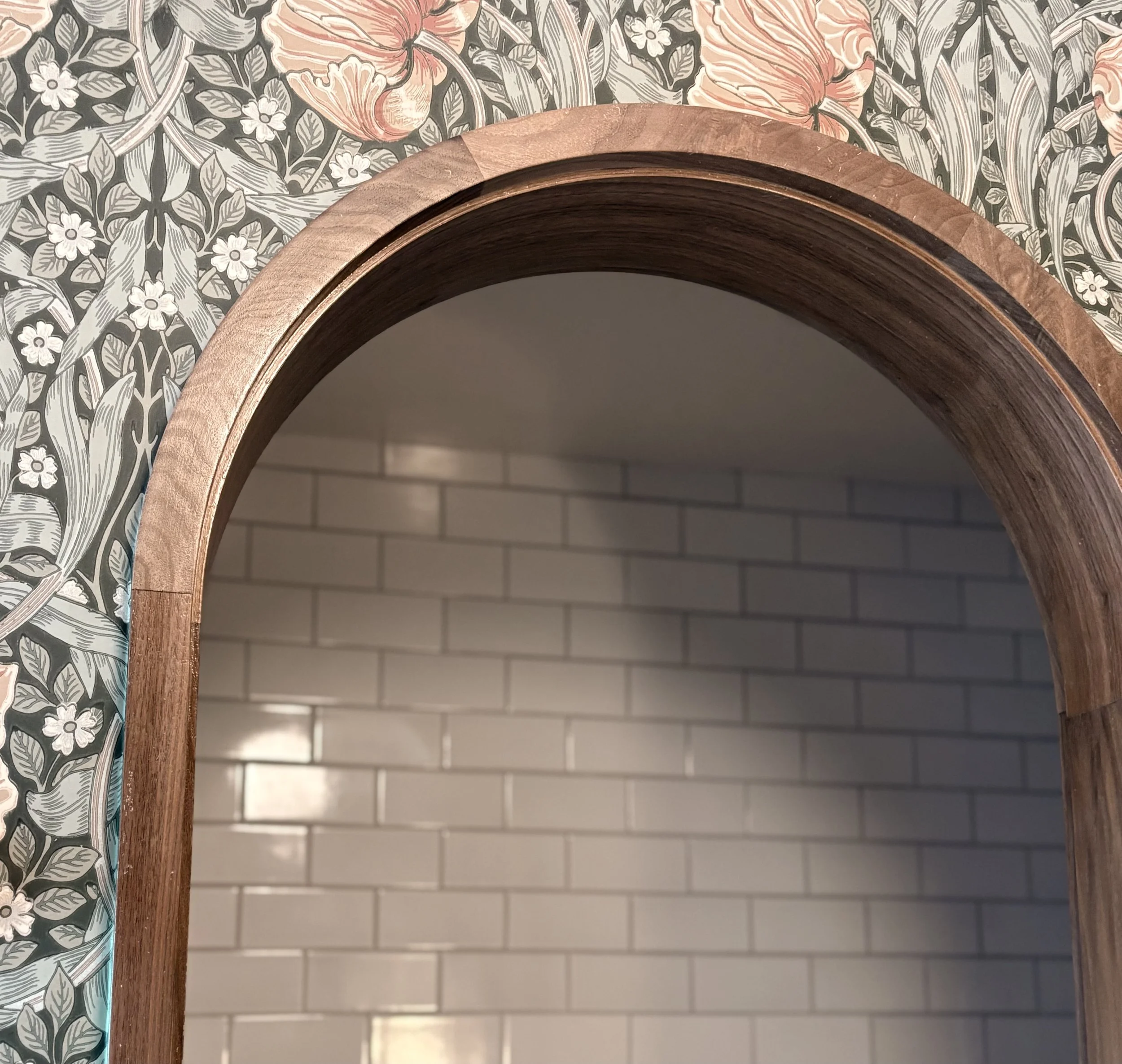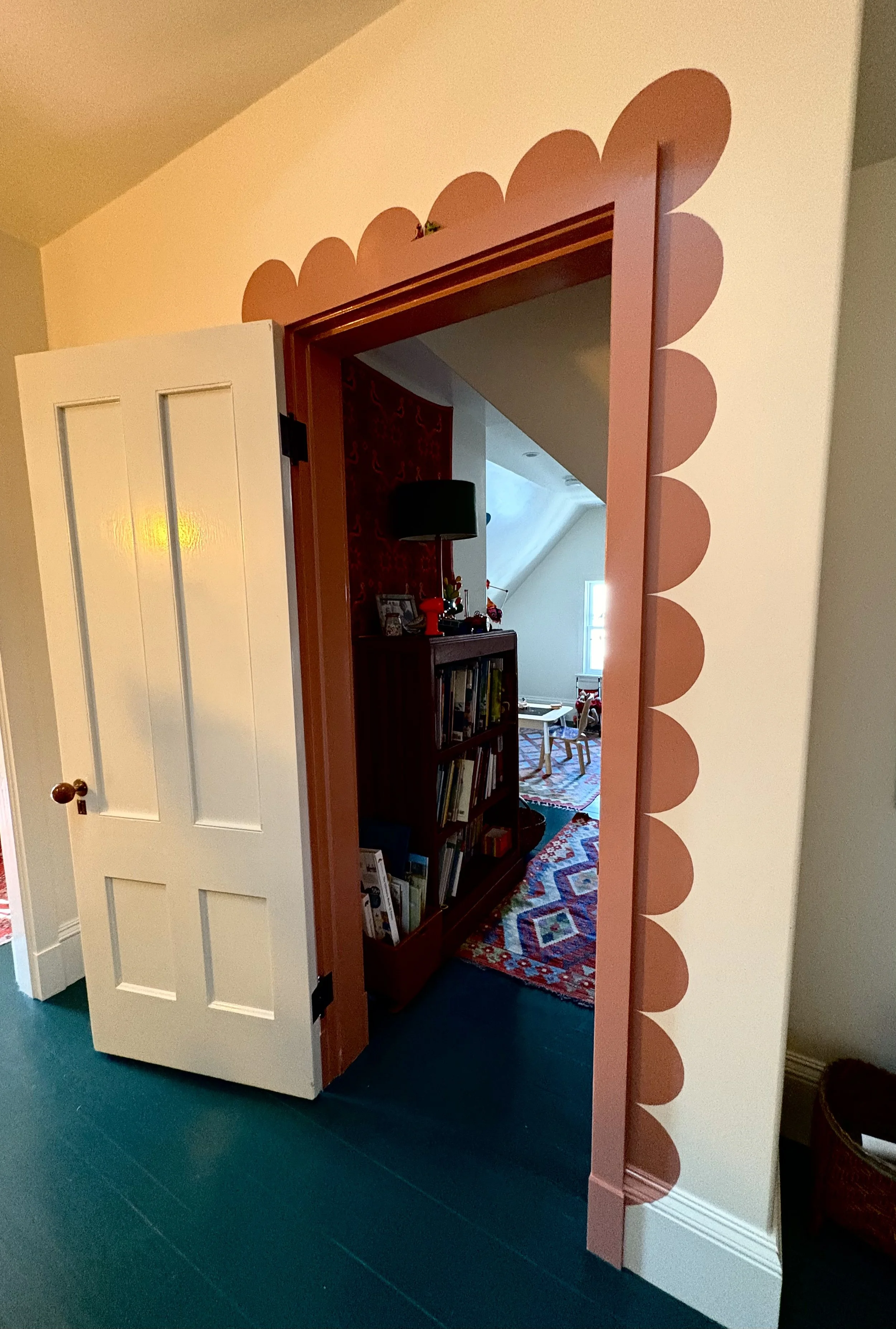 The home had not been updated in almost 50 years. Spaces were constrained, the interior materials dated and degraded. We opened internal and external walls, and attempted to fill the interior spaces with the maximal amount of salvaged or sustainably produced materials, including salvaged walnut, salvaged oak, reclaimed banisters and tracery, terra cotta and recycled brick tiles. Trims were painted in bright alluring colors, and built-ins were given arches, tracery and sumptuous moldings. The result is a new renovation that feels warm, enchanting and timeless.