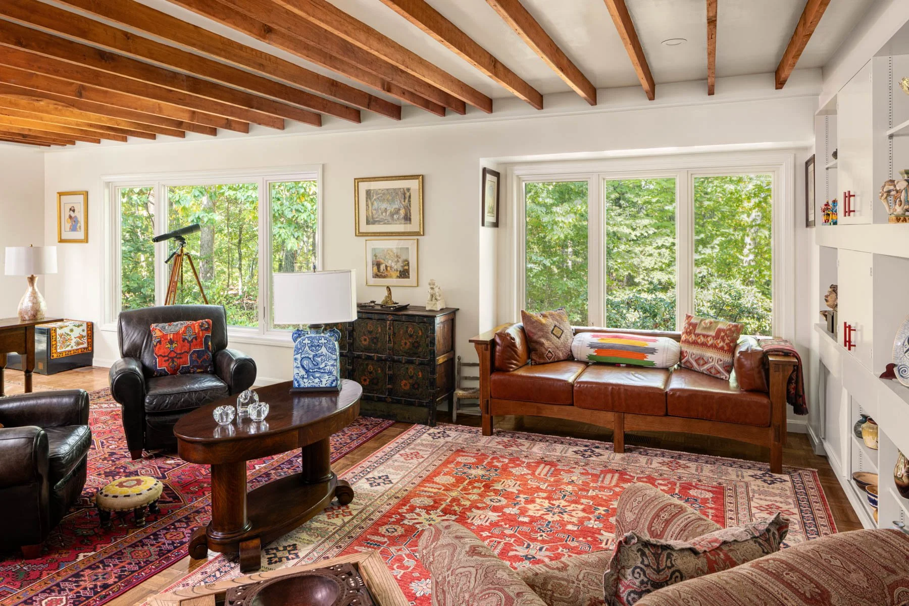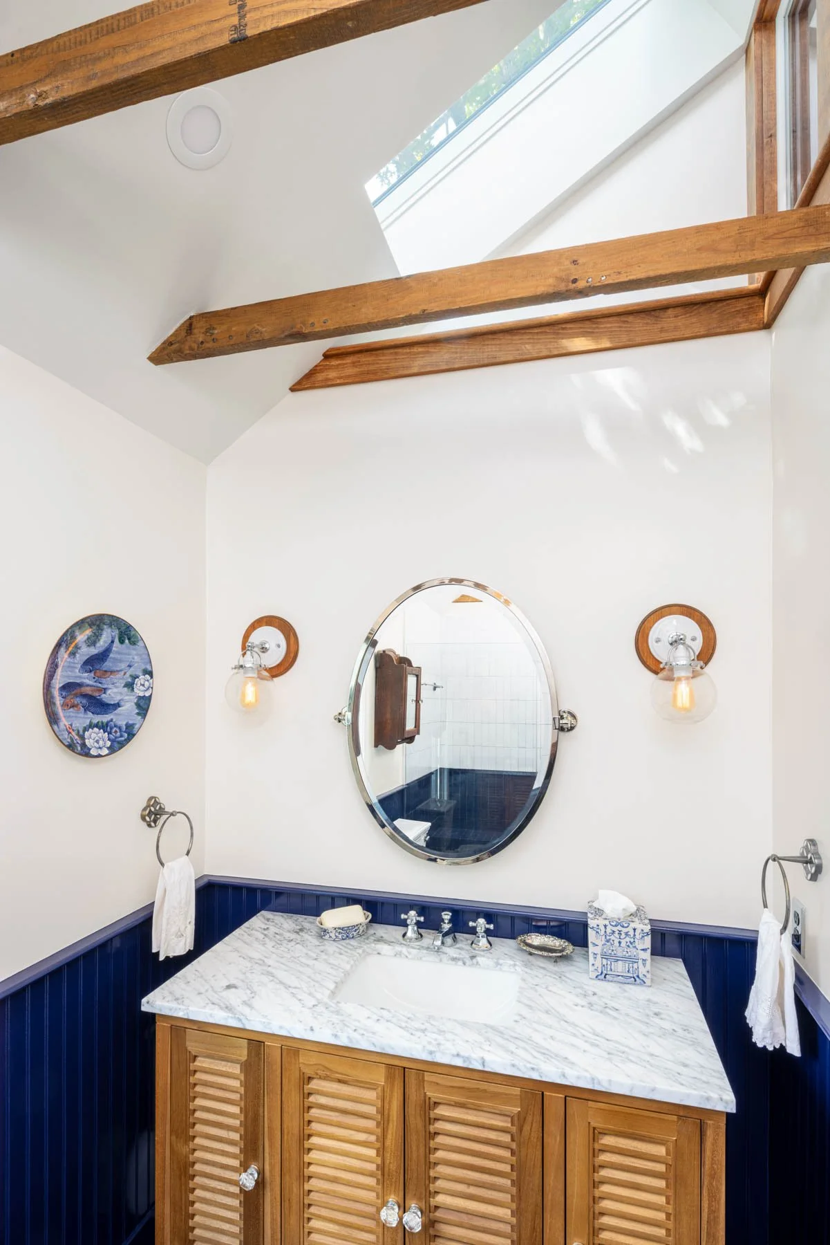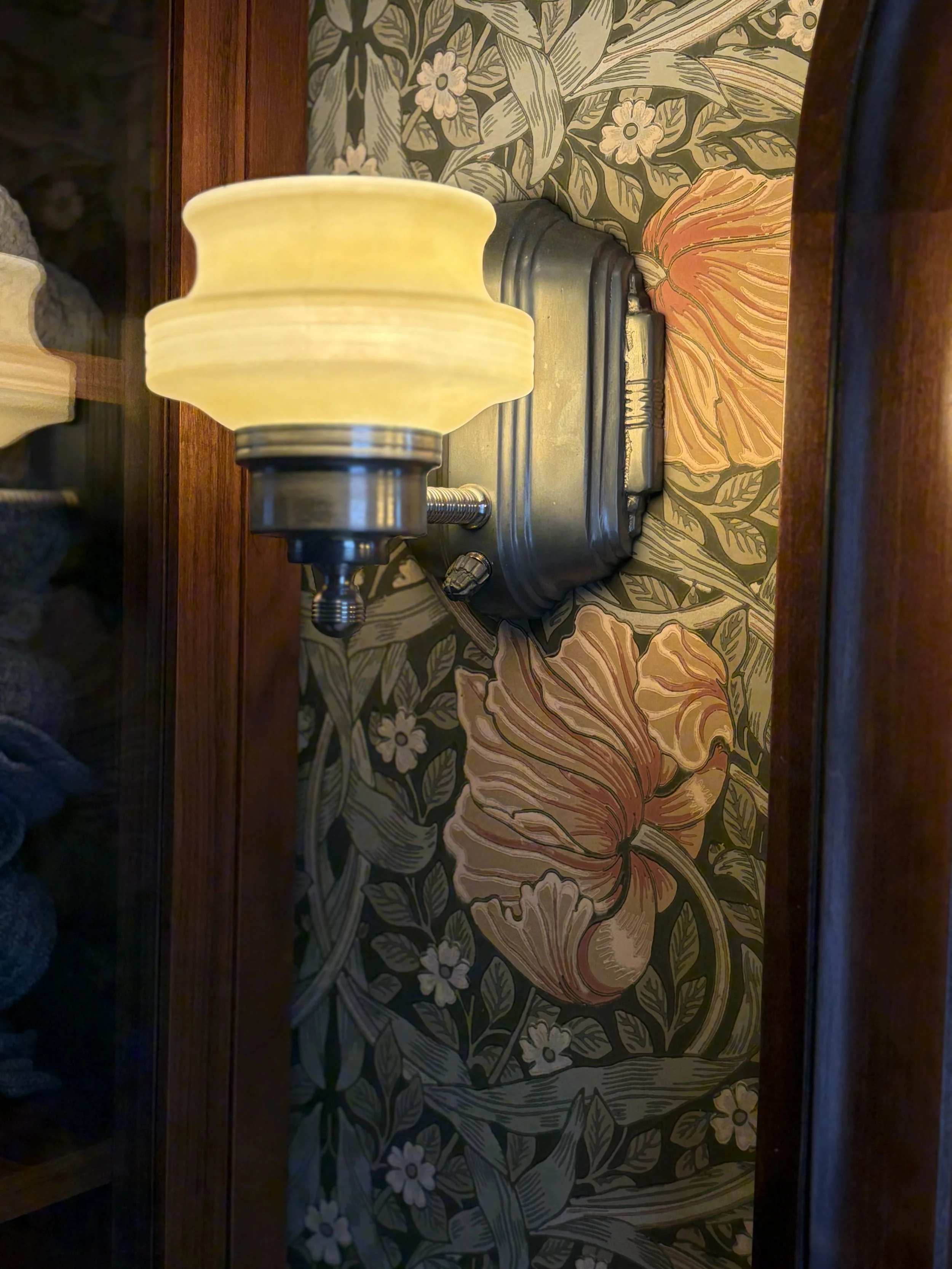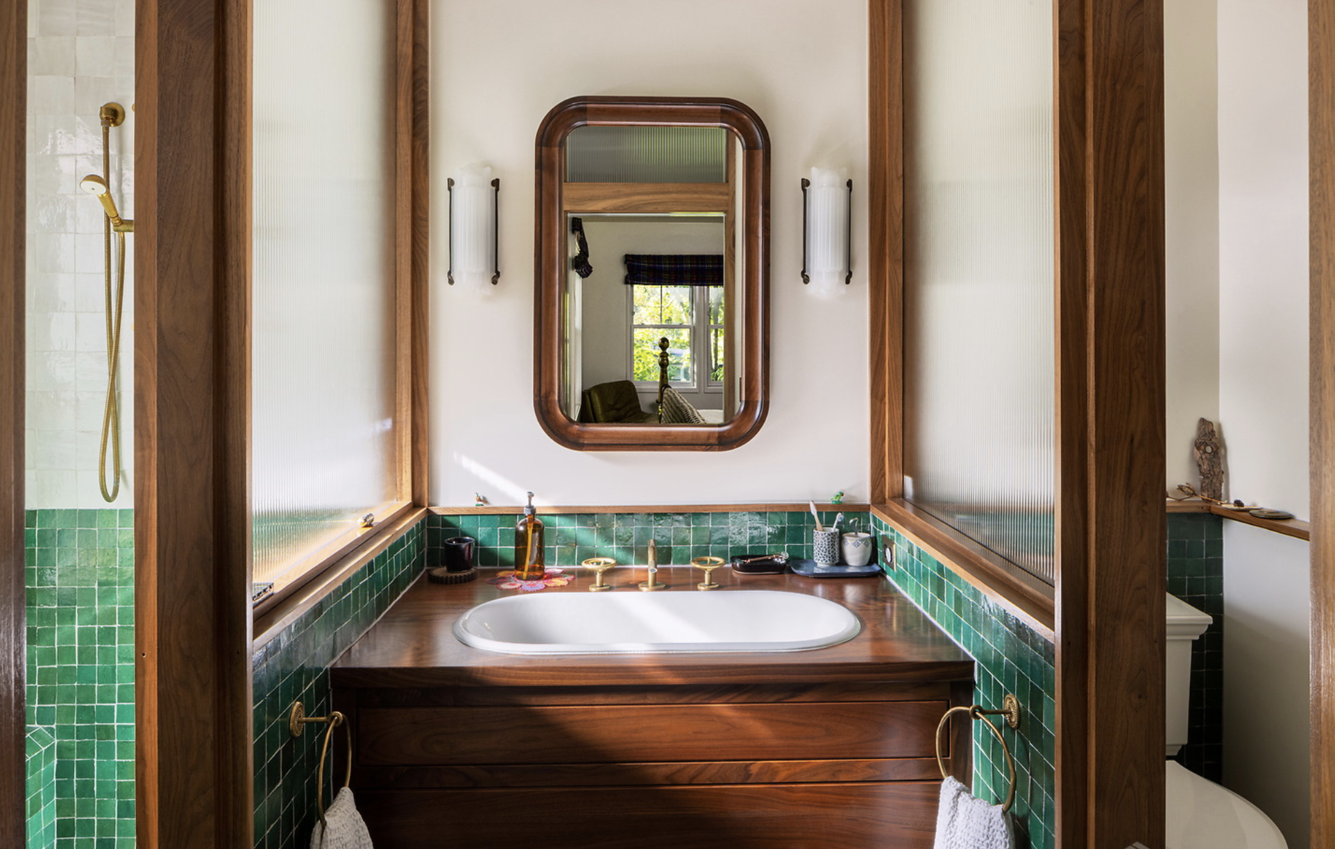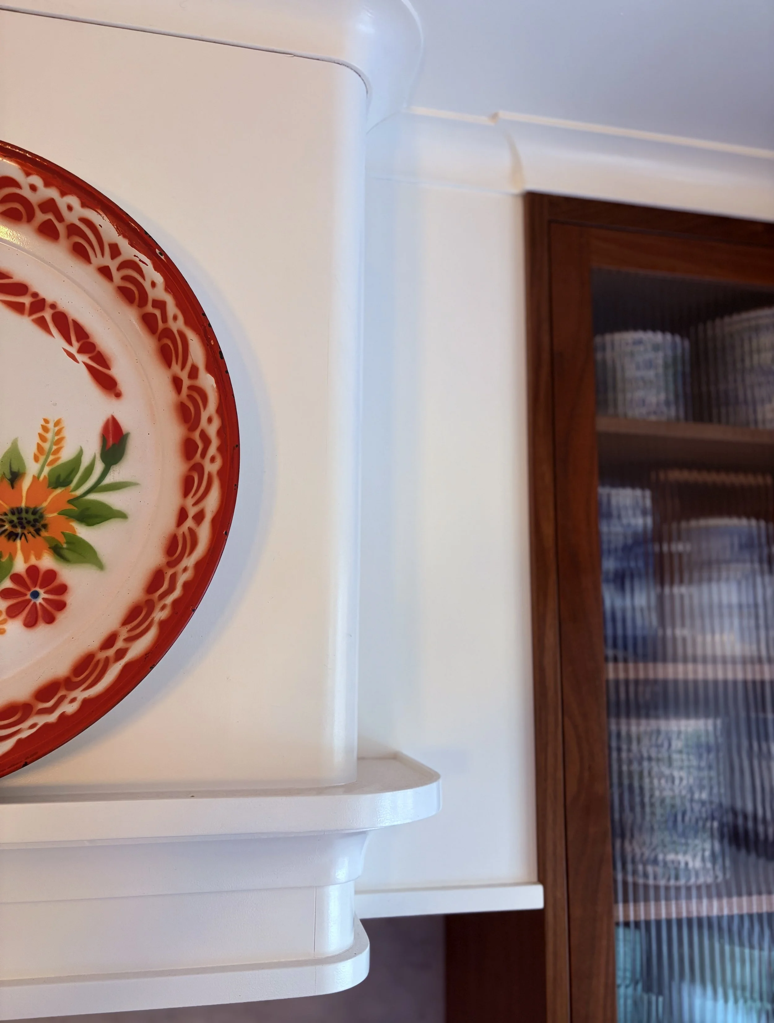 The home had not been updated in almost 50 years. Spaces were constrained, the interior materials dated and degraded. We opened internal and external walls, and attempted to fill the interior spaces with the maximal amount of salvaged or sustainably produced materials, including salvaged walnut, salvaged oak, reclaimed banisters and tracery, terra cotta and recycled brick tiles. Trims were painted in bright alluring colors, and built-ins were given arches, tracery and sumptuous moldings. The result is a new renovation that feels warm, enchanting and timeless.